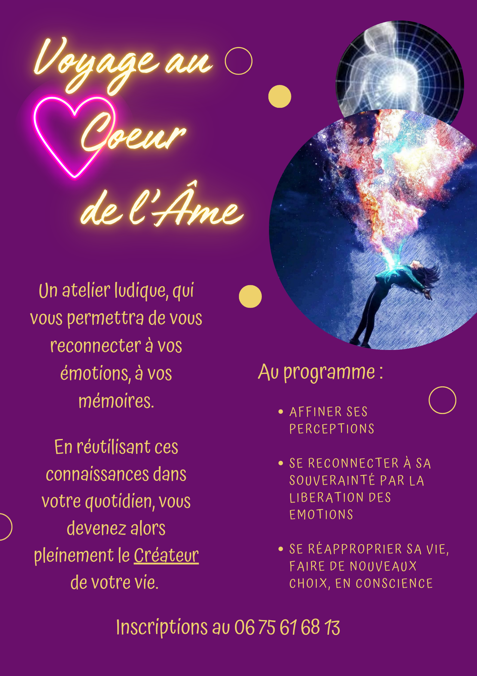 Animé par Virginie Coille Praticienne en Thérapie Multidimensionnelle Date et horaires : 10 mai 2026 Durée : 3h Nombre de places : 10 Publics : Adultes Tarifs : 30 Euros dont 10 Euros d’acompte à la réservation Inscription : 0675616813 (réservation obligatoire) Paiements acceptés : CB, espèces Description de l’activité : Un atelier ludique qui vous permettra de : comprendre pourquoi vos émotions sont des […]