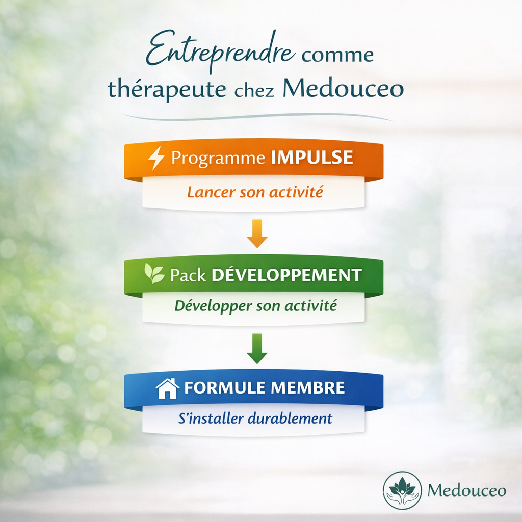Chez MEDOUCEO, nous avons fait le choix d’accompagner les thérapeutes dans cette réalité professionnelle. Notre approche ne se limite pas à la mise à disposition d’espaces de travail : nous avons conçu un véritable parcours d’accompagnement entrepreneurial, pensé pour soutenir les praticiens à différentes étapes de leur développement.